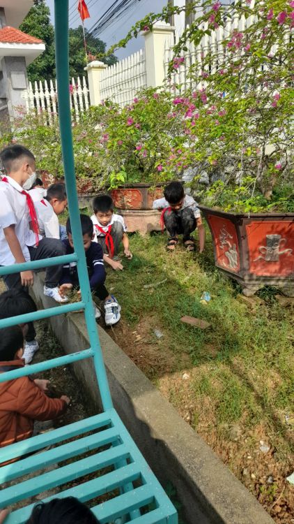 Các em Đội Viên nhặt cỏ, nhặt rác trong khuôn viên nhà trường